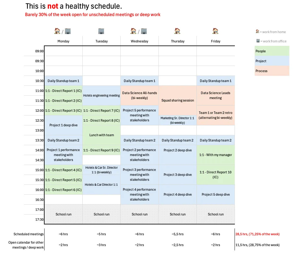 Due to a set of circumstances, in January 2024 I found myself leading 2 data science squads. I had been leading the marketing DS team for a couple of years, and senior leadership asked me to steer the hotels team. In total, with both teams, I was overseeing 10 individual contributors and 5 projects. I knew that time was going to be a problem, and I was right. This is how my calendar looked like.