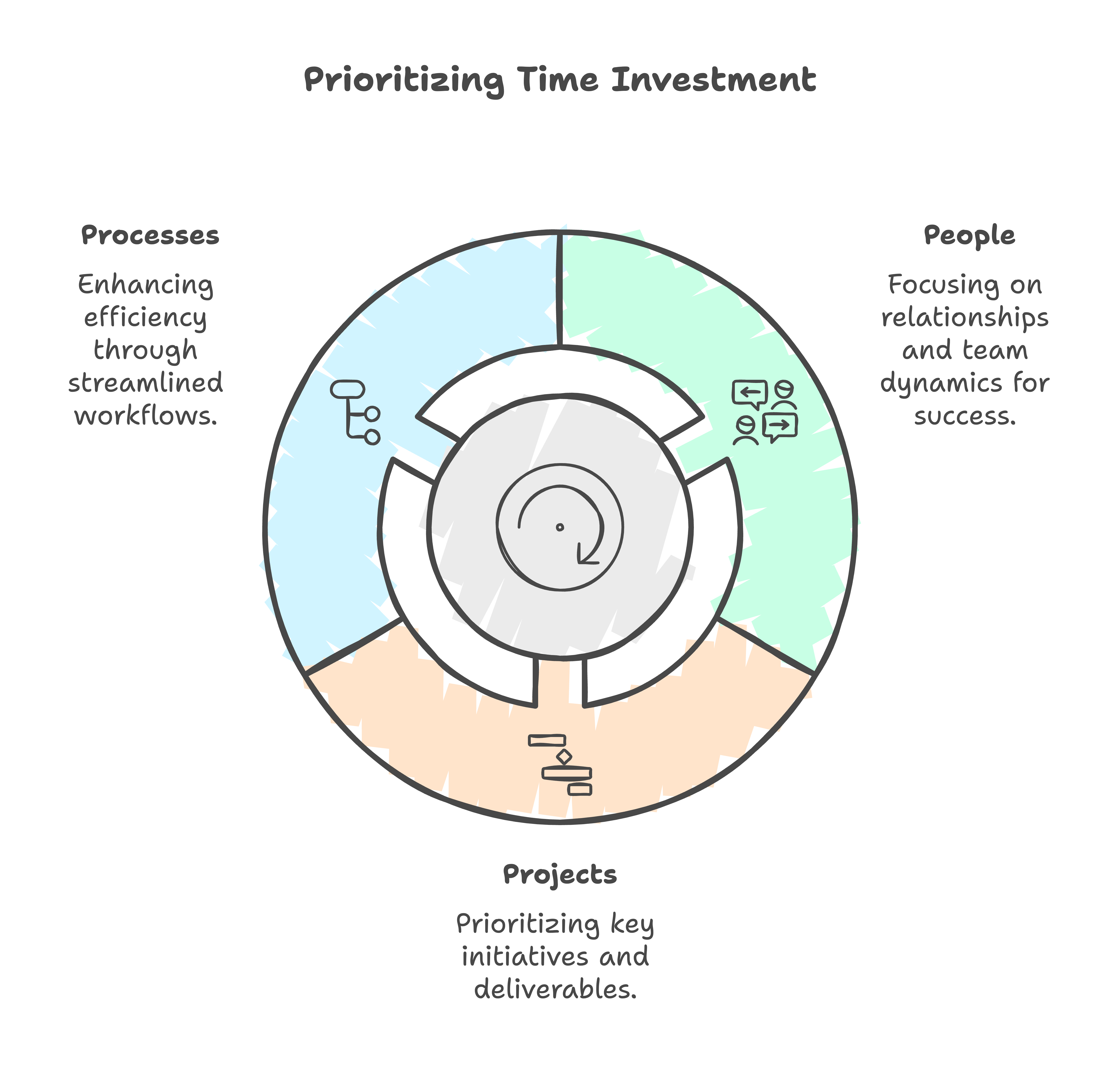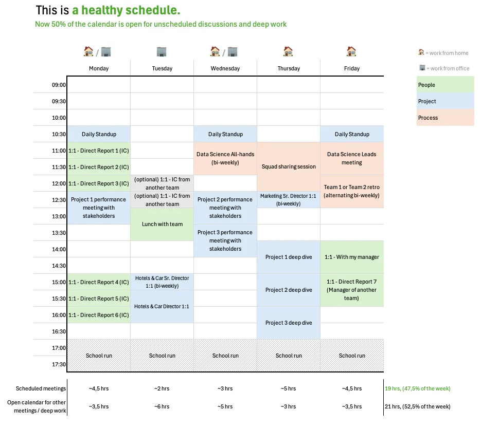 This is the way I currently lead 1 Data Science squad of 6 data scientists, manage the lead of another 6 person squad and am accountable for 5 to 6 projects. As of today, this time management framework has worked for me. Time will tell if, with bigger responsibilities, I need to shift this way of working.