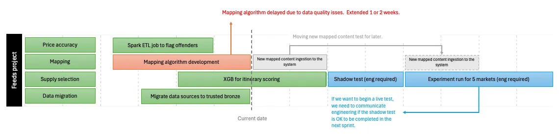 As a senior data science manager, delivery is as important as the individual folks in the team. We need to deliver value. And you can’t deliver value if you don’t understand what is happening. This is why I have 3 types of scheduled meetings to cover project specific stuff (you can see them coloured in blue).